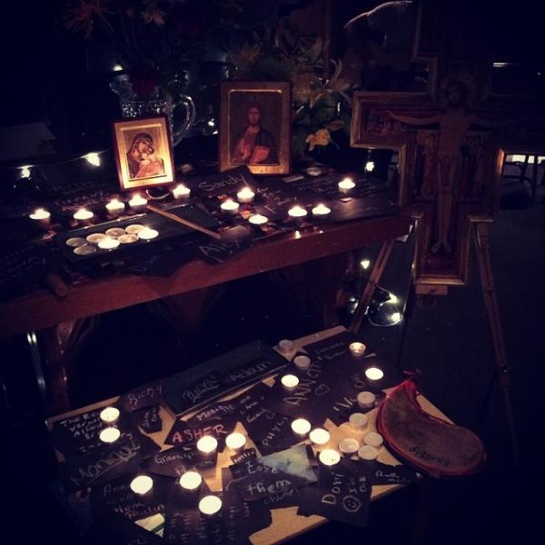 Perichoresis, an emerging worshiping community at Trinity Episcopal Church on the Green in New Haven, CT, celebrated All Saints and Souls at their bi-weekly table Eucharist. Those in attendance shared about the saints in their lives over dinner, and constructed an altar of remembrance for the departed. Photo Credit: Zack Nyein