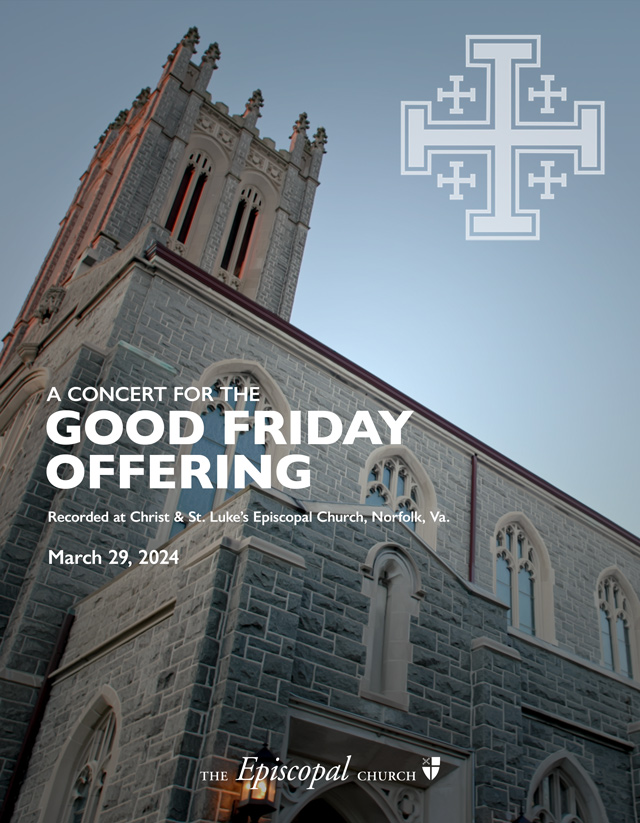 Recorded at Christ and St. Luke’s Church, Norfolk, in the Episcopal Diocese of Southern Virginia, A Concert for the Good Friday Offering will air online at 3 p.m. ET March 29 on The Episcopal Church’s Facebook page, YouTube channel, and website. Viewers will have the opportunity to make donations during the event to go toward the offering, also frequently gathered by churches during Good Friday services.